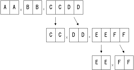 // その後,c1,c2,d1,d2から同じような計算式で,e1,e2,f1,f2を求めぞろ目となるか調べる。