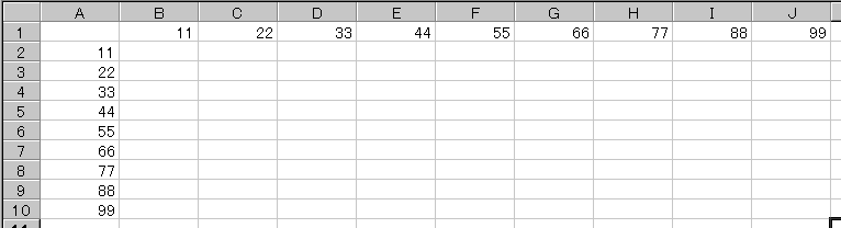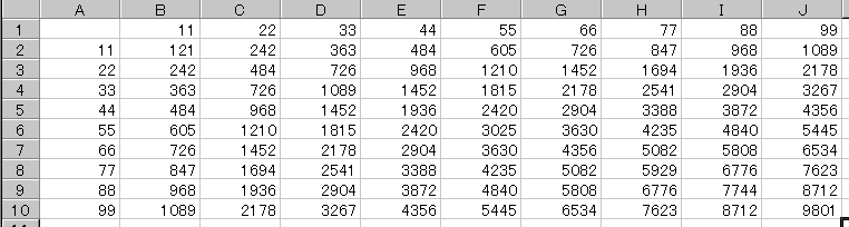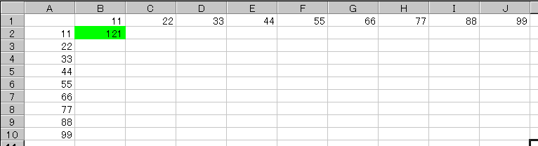 計算結果を表示するのはまずB2の位置に「=$A2*B$1」という式を入れる。