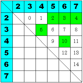 以下のような表を考える。例えば行3,列6の数字10は,ビット10を示し,ビットがONの時,3と6を連結することを意味する。