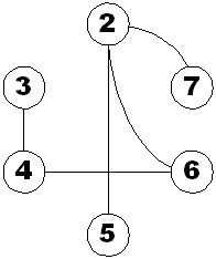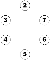2から7までの数字がある。これらを線で結び,全ての数字に対し,その数字と直接結ばれた数字の合計が18になるようにする。
